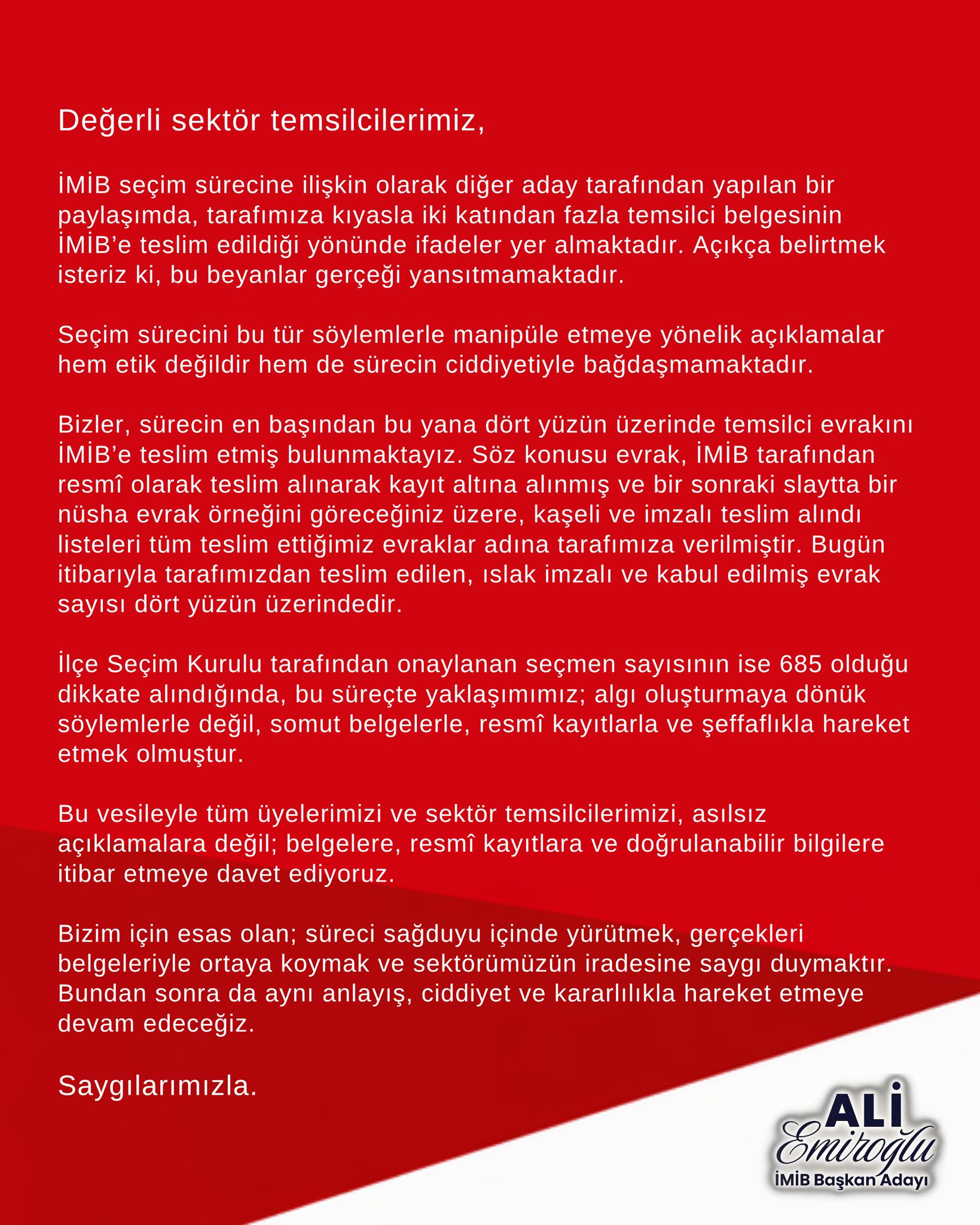 Köşemi hazırlarken Ali Emiroğlu’nun hala İMİB Başkan Adayı imzasıyla gönderdiği son basın açıklamasını da yayınlıyor ve sektörün takdirine bırakıyoruz.