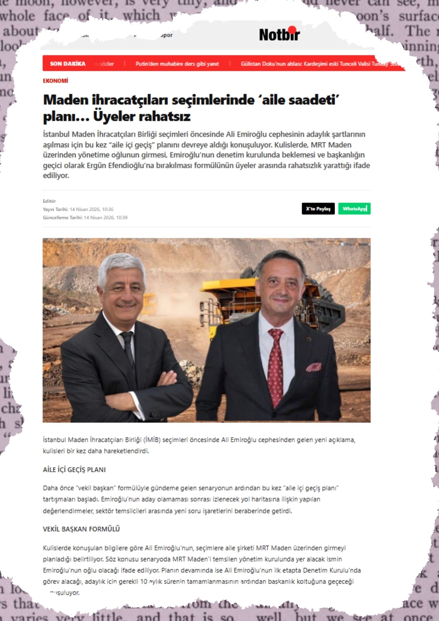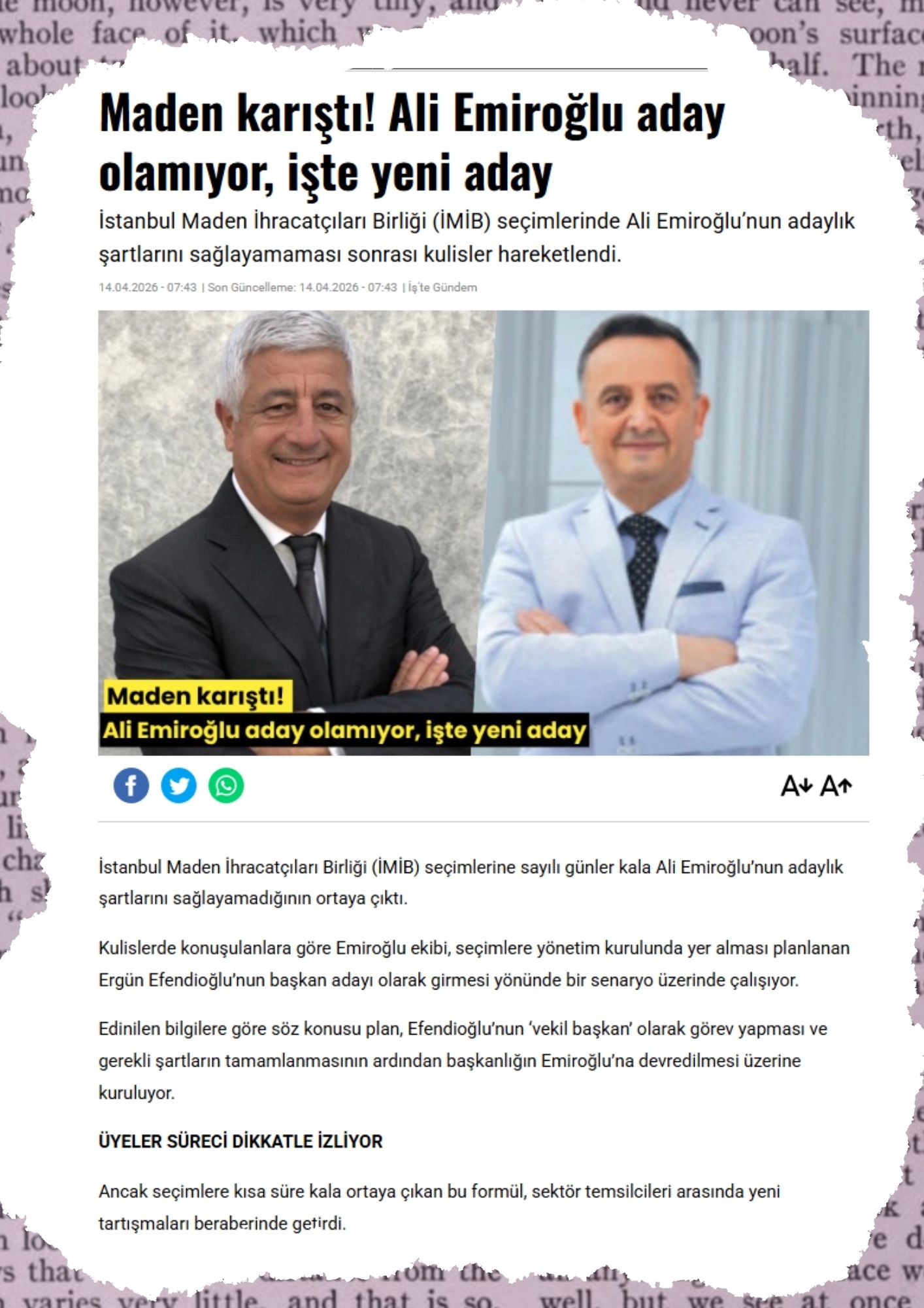 Ulusal medyada yer alan ve adeta bomba etkisi yaratan haberlerde, İMİB başkan adaylarından Ali Emiroğlu’nun seçime katılamayacağı ifade ediliyordu. Okuduğumda ve duyduğumda şok oldum. Çünkü yazılan haberler ve yazanlar ulusal çapta olan gazetelerdi. Üstelik biz bu haberleri Ali Emiroğlu tarafından düzenlenen basın toplantısındayken okuduk ve gördük.