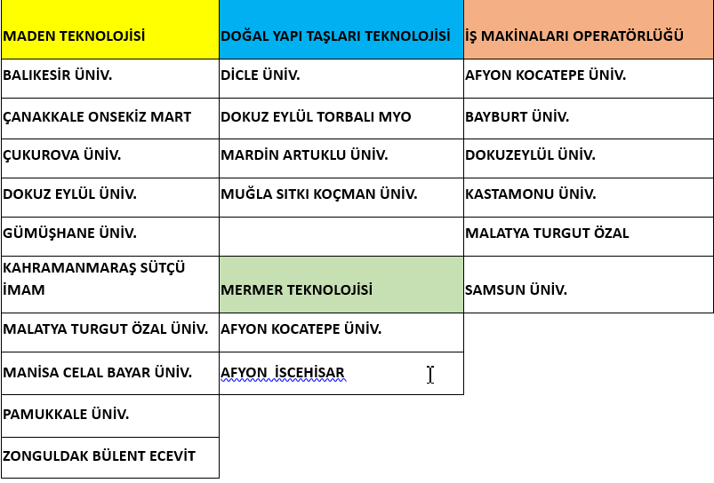 2023 yılında faal olan meslek yüksek okulları Maden Teknolojisi, Doğal Yapı Taşları Teknolojisi, Mermer Teknolojisi ve İş Makinaları Operatörlüğü bölümleri ile üniversitelerin Maden Mühendisliği, jeoloji mühendisliği bölümleri aşağıda tabloda verilmiştir.